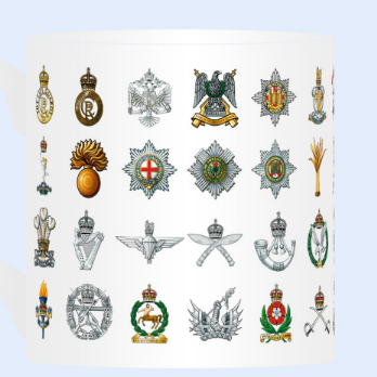 A premium bone china mug presented in gift box, featuring the current active Regimental and Corps badges. Made in the UK.